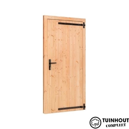 De deur heeft een buitenmaat van 1000 mm breed bij 2050 mm hoog en is geschikt voor tuinhuisjes, schuren en andere buitenconstructies.