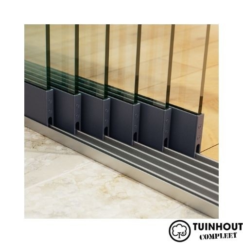 Voor een compleet en strak resultaat is deze glazen schuifwand uit te breiden met verschillende accessoires. Denk aan tochtstrips voor extra bescherming tegen wind en insecten, funderingsbalken voor een stabiele en waterpas ondergrond of glasopvangprofielen voor een nette aansluiting tegen muur of staander. Ook deurgrepen, meenemers en Steel Look strips zijn mogelijk voor extra gebruiksgemak en een moderne uitstraling.